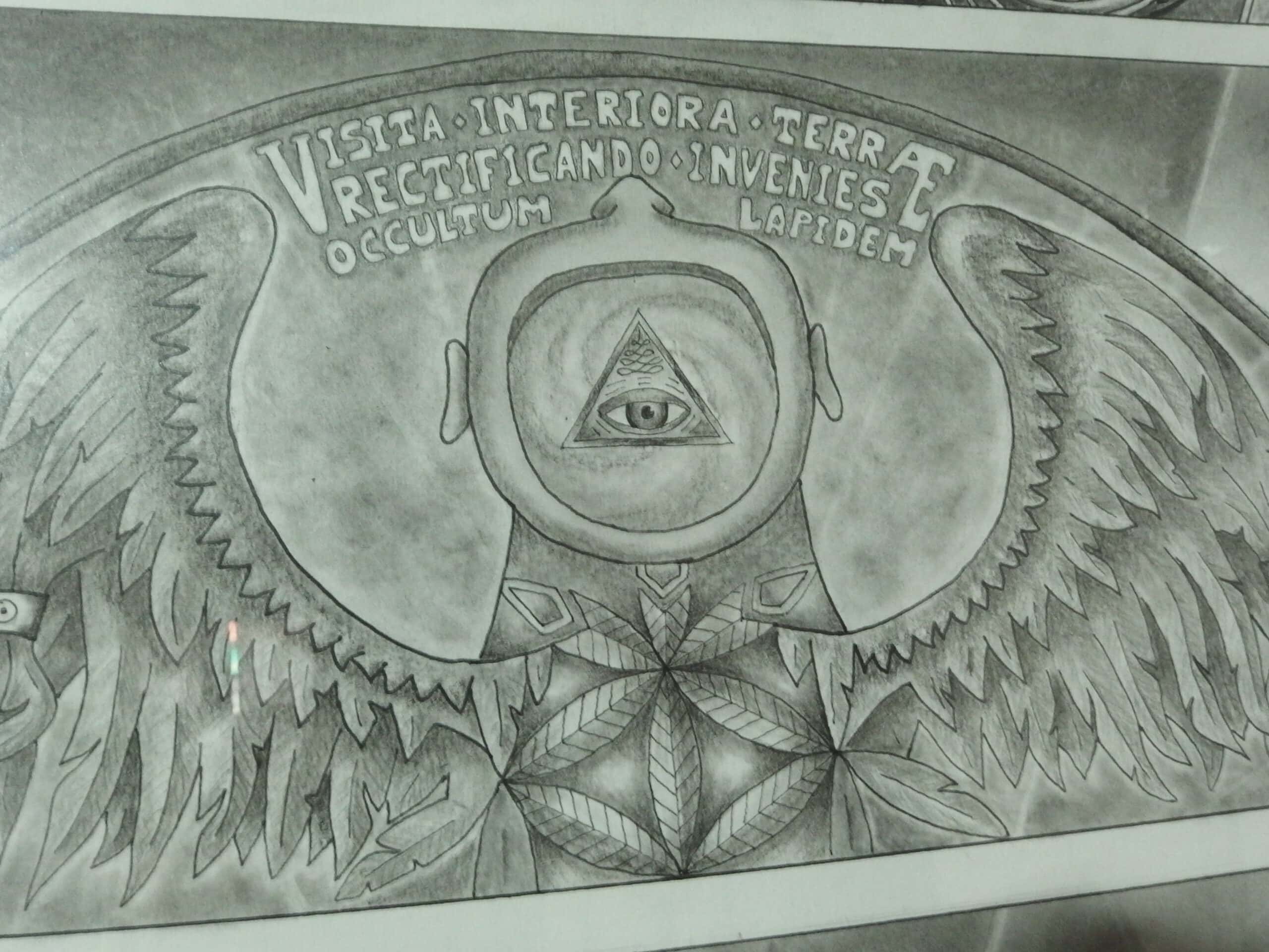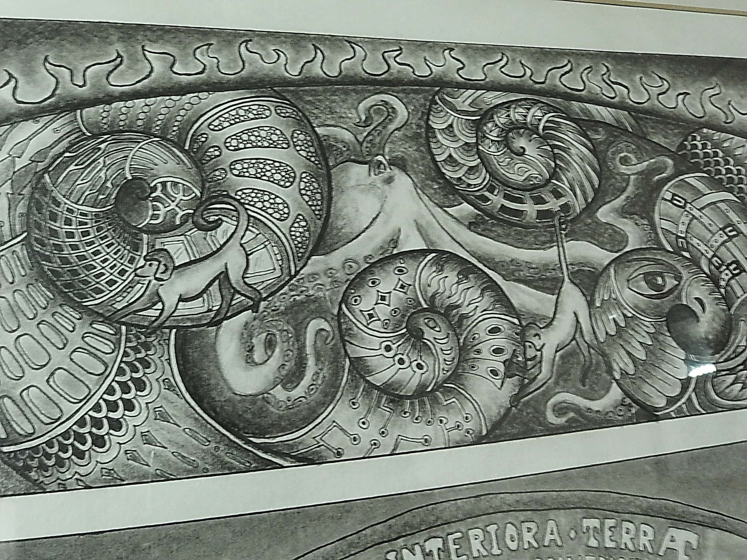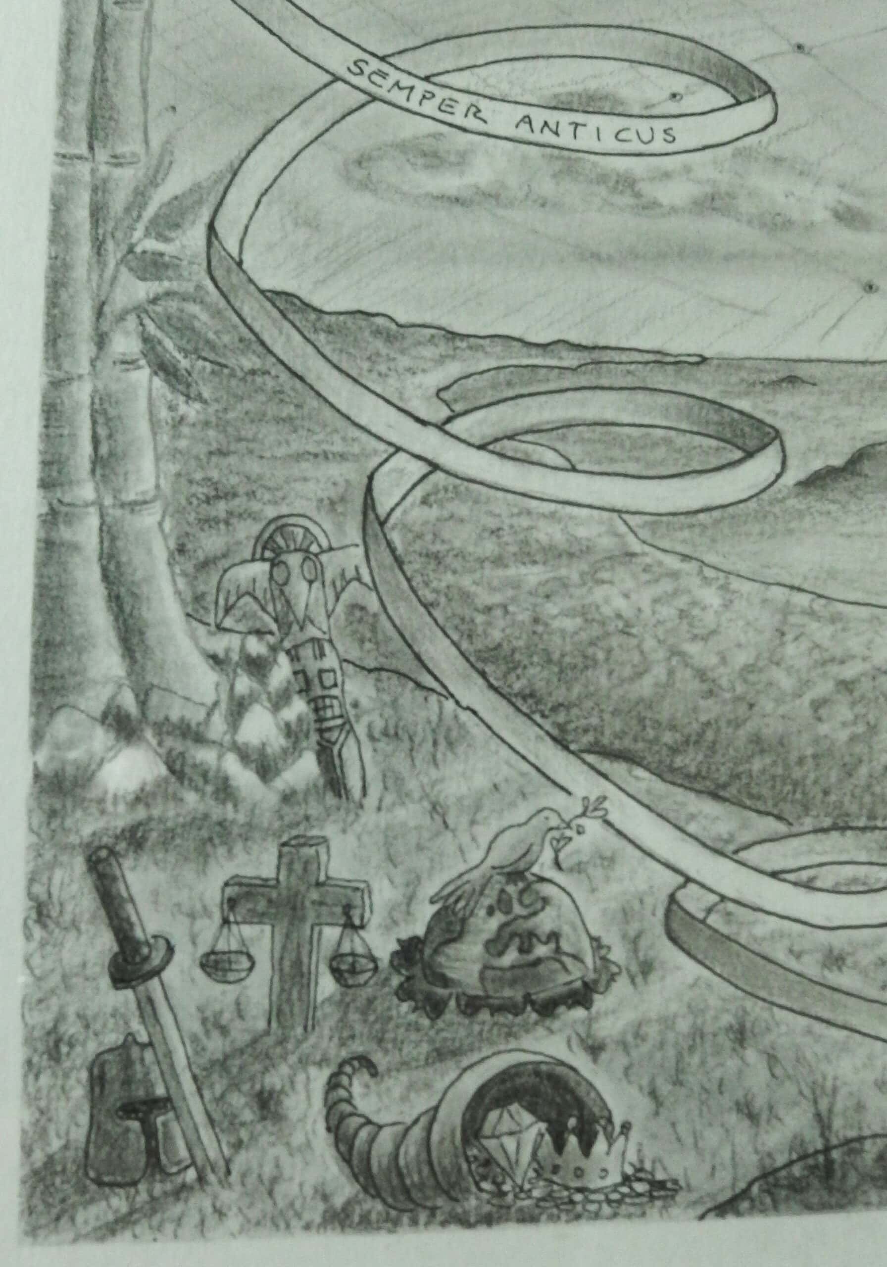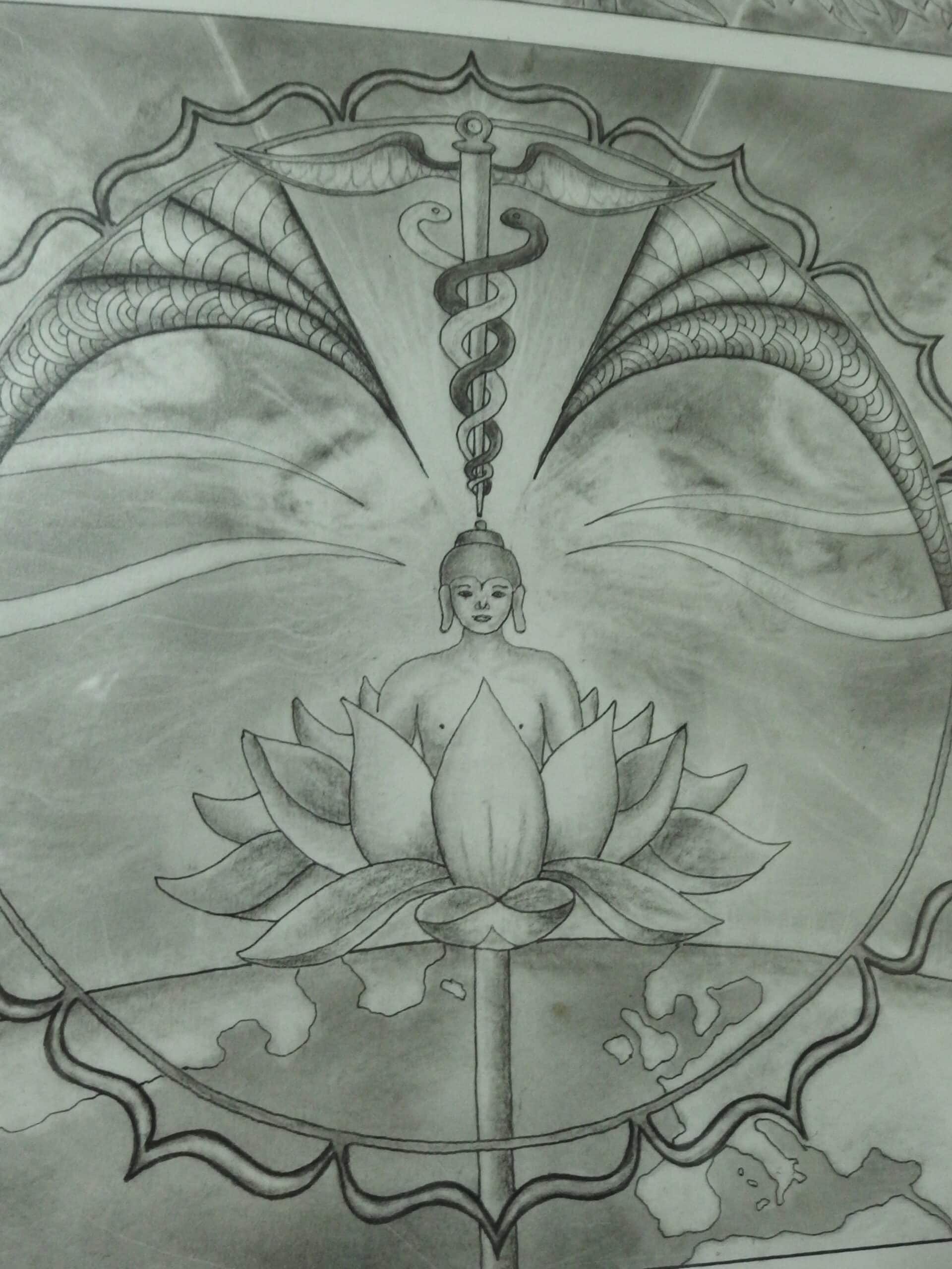 Once the general motive for the drawing has taken shape in my mind, I start to draw it using charcoal and black pen. The only colours used are those relative to the colours of the stages (i.e. the Thin Blue Line separating order from chaos; the dove with the green branch). The drawing process is quite fast compared to the incubation process. Everything falls in place without much effort and that’s the best part: “Being in the zone”, when a light footed dance of balance between conscious form and unconscious creative flow takes over. During this time I hardly eat or rest and I don’t really feel the need for it.