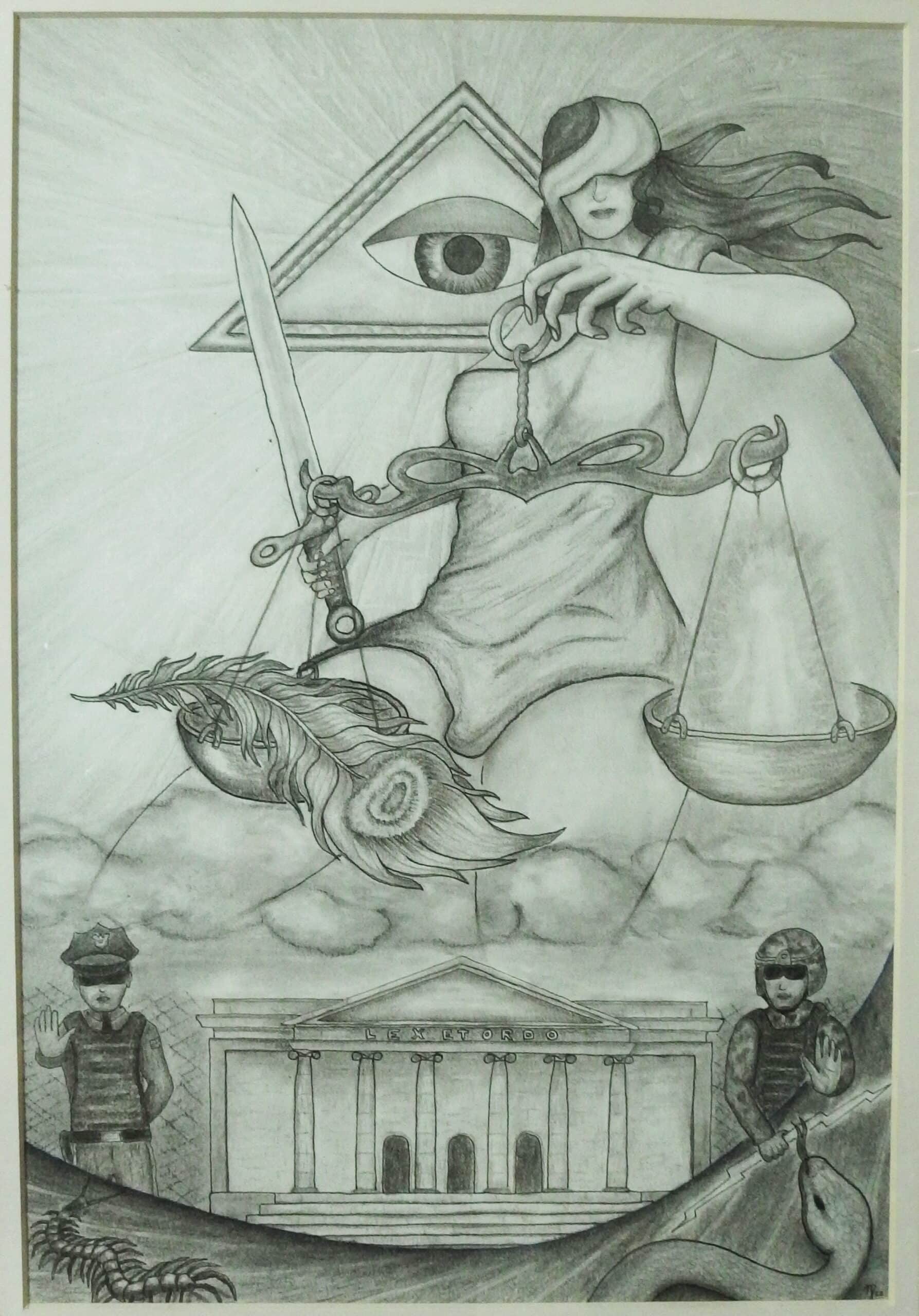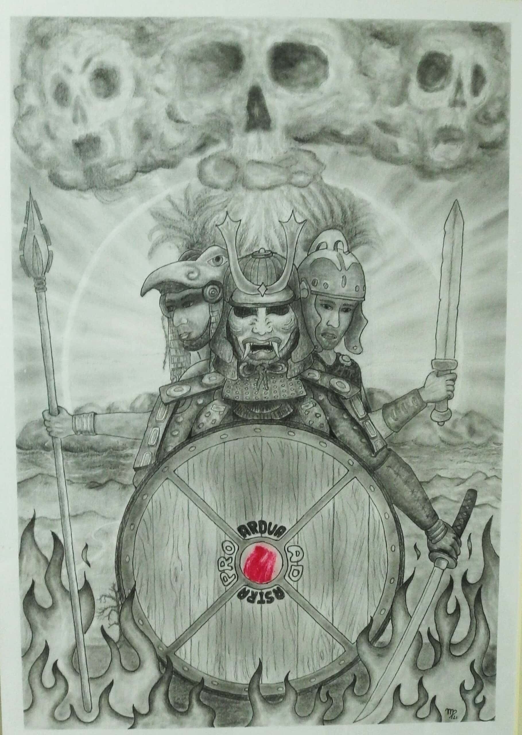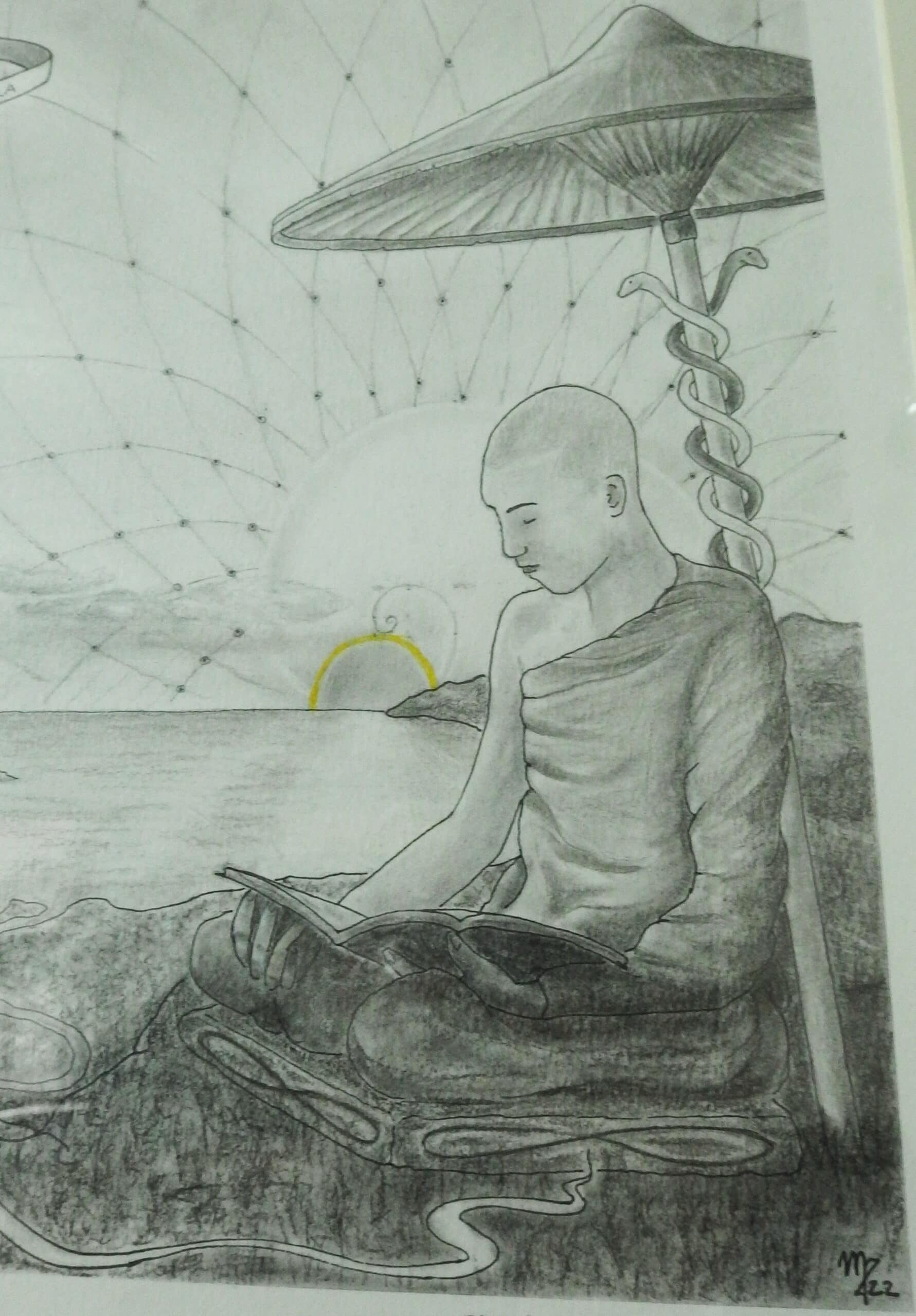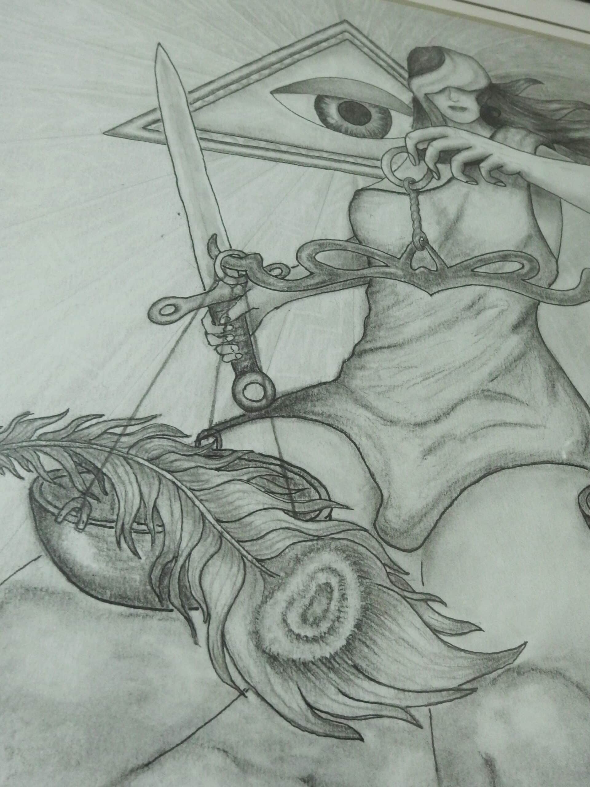 Once the general motive for the drawing has taken shape in my mind, I start to draw it using charcoal and black pen. The only colours used are those relative to the colours of the stages (i.e. the Thin Blue Line separating order from chaos; the dove with the green branch). The drawing process is quite fast compared to the incubation process. Everything falls in place without much effort and that’s the best part: “Being in the zone”, when a light footed dance of balance between conscious form and unconscious creative flow takes over. During this time I hardly eat or rest and I don’t really feel the need for it.