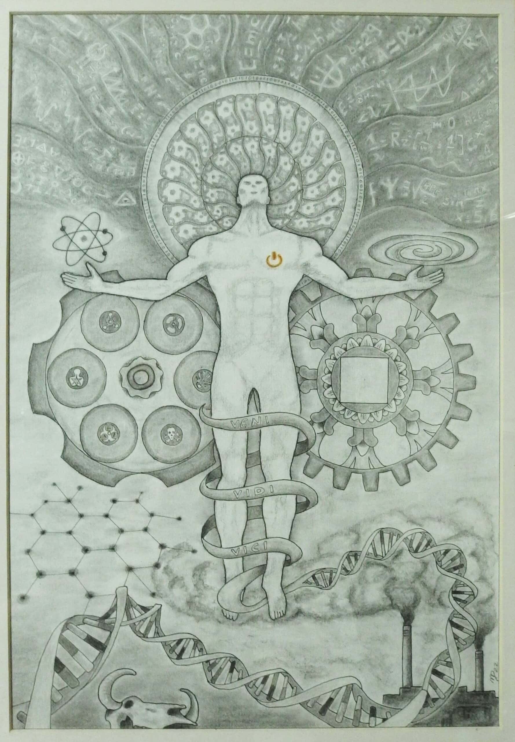 Once the general motive for the drawing has taken shape in my mind, I start to draw it using charcoal and black pen. The only colours used are those relative to the colours of the stages (i.e. the Thin Blue Line separating order from chaos; the dove with the green branch). The drawing process is quite fast compared to the incubation process. Everything falls in place without much effort and that’s the best part: “Being in the zone”, when a light footed dance of balance between conscious form and unconscious creative flow takes over. During this time I hardly eat or rest and I don’t really feel the need for it.