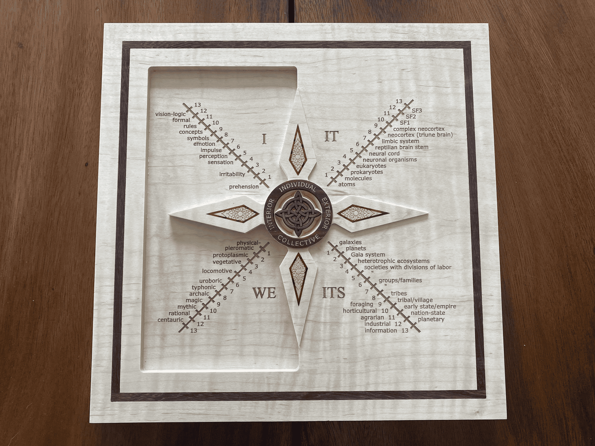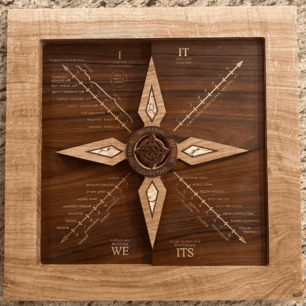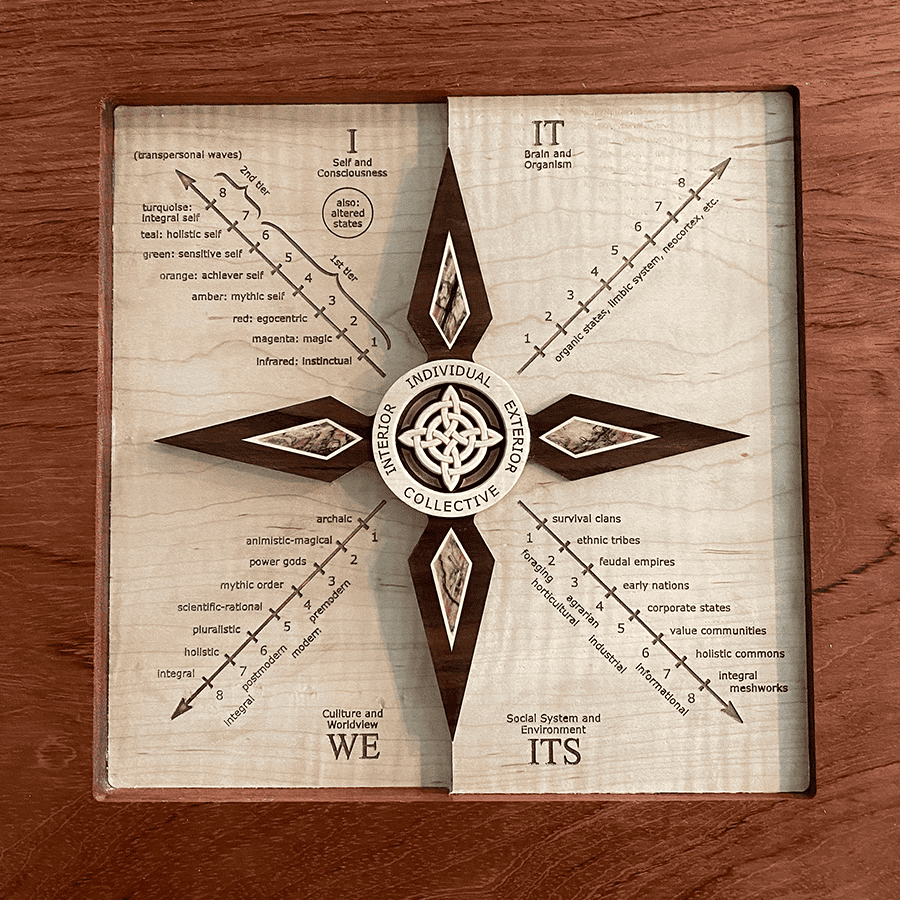 Corey then talks about his latest creation, ‘Fourth Turning Dharma Wheel’, a beautiful three-dimensional mandala representing the ‘fourth turning’ of Buddhism, with symbols representing the four Quadrants (and, indeed, the eight ‘zones’ of Integral Methodological Pluralism).