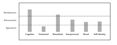 Lines of development are another way to describe the distinct capacities that develop through levels in each aspect of reality as represented by the quadrants. So if levels are contour-lines on a hiking map for reality, then lines of development represent the various trails you can take to transverse the vast wilderness of human potential. For example, in the individual-interior quadrant of experience, the lines that develop include, but are not limited to, cognitive, emotional, interpersonal, and moral capacities. These capacities are often thought of as the multiple intelligences that each person has. The idea being that each of us is more developed in some areas than others. Integral theory uses a psychograph to depict an individual’s unique assortment of development in various individual lines (Fig. 7).